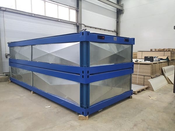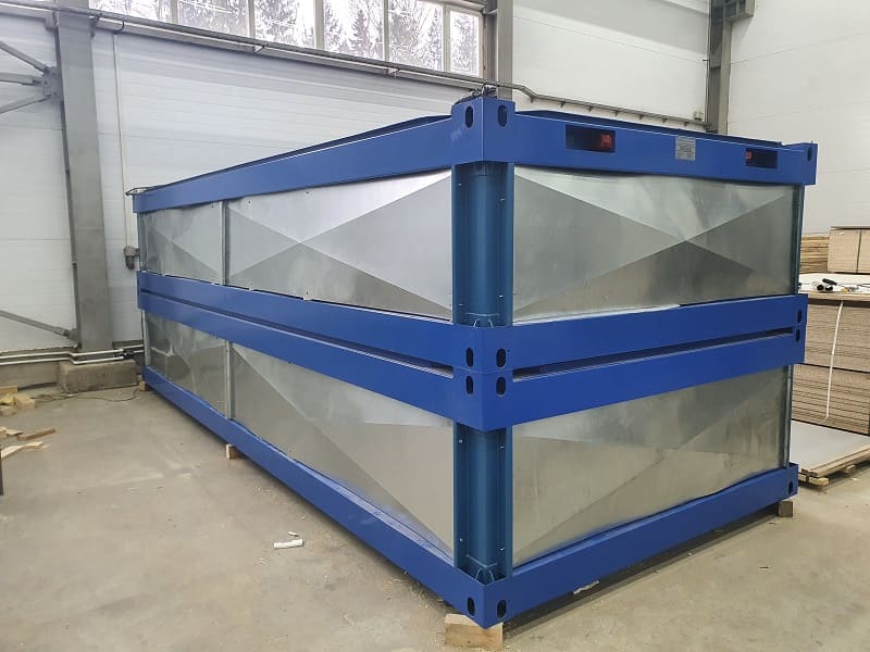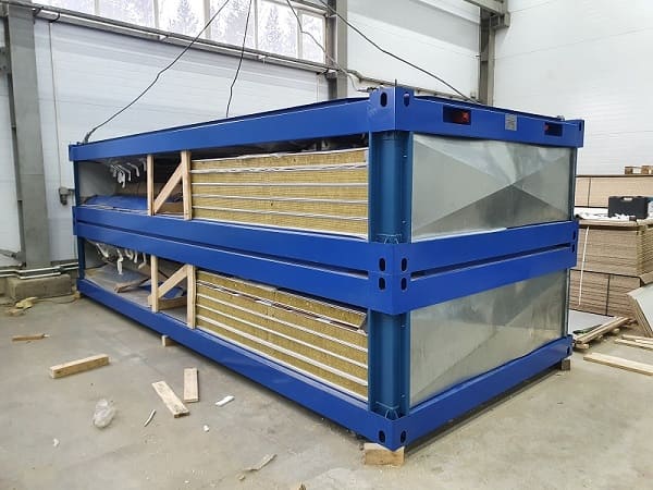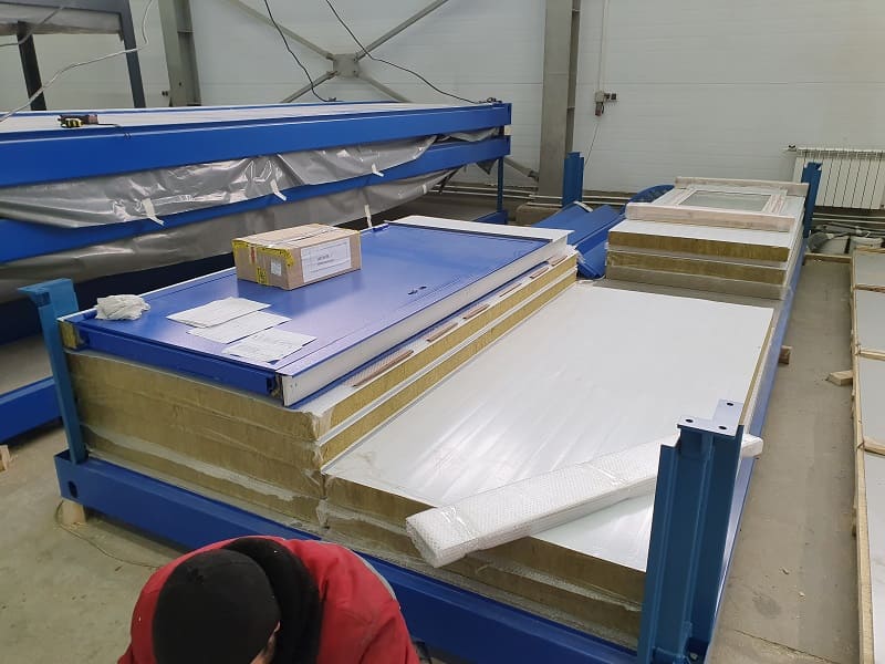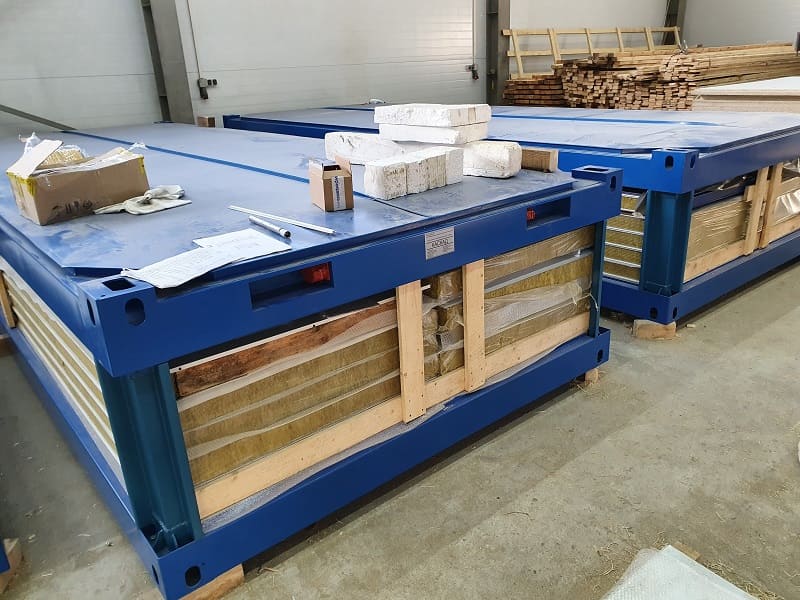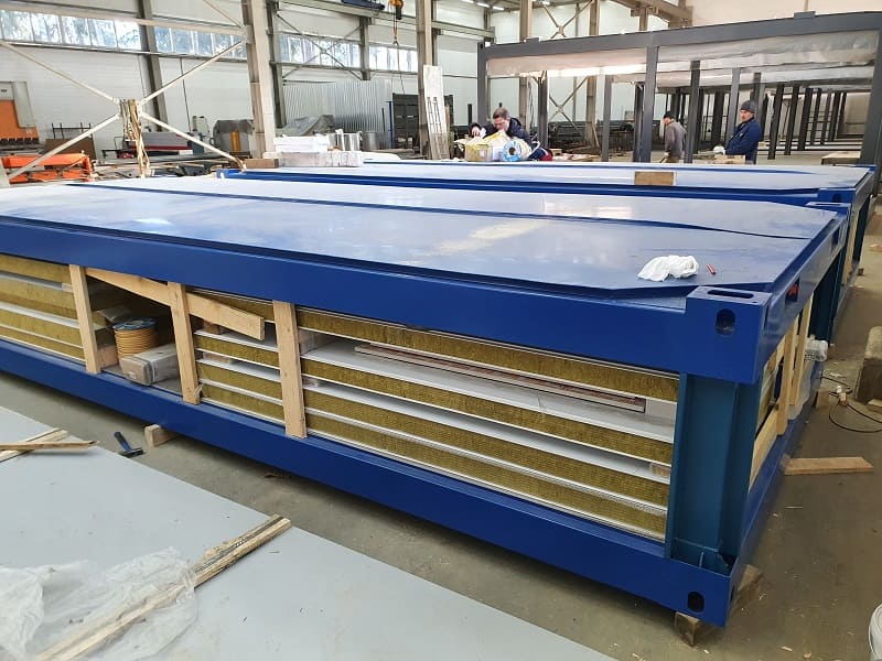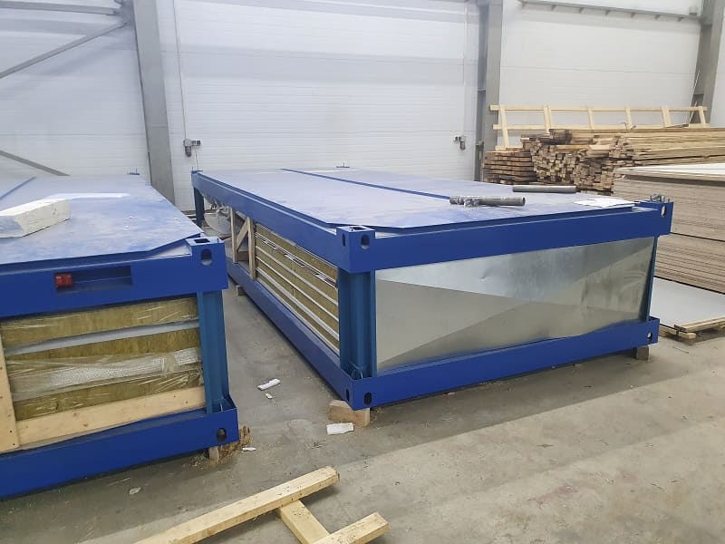 Блок-контейнеры "КАСКАД". Набор мобильных модулей изготавливался для самостоятельной сборки Заказчиком. Место поставки: Азов. Особенности. Для данной поставки нами был разработан способ монтажа рулонных ставень в трехслойную сэндвич-панель. Так называемые интегрированные роль-ставни.Мобильные модули в транспортной форме TransPack